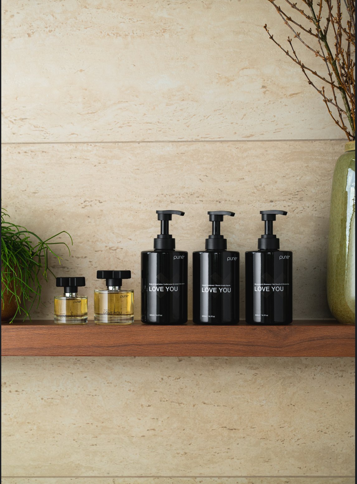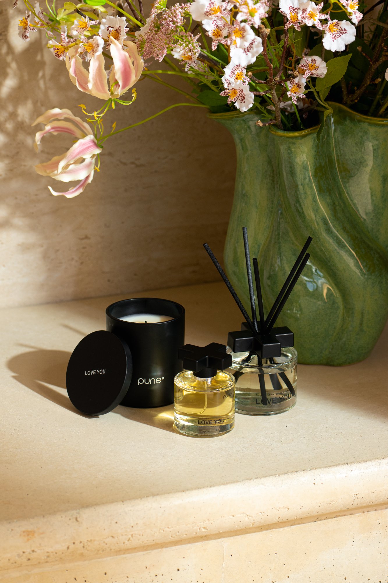 LOVE YOU, WANT YOU en MISS YOU delen dezelfde geuridentiteit. Ontworpen om elkaar te complementeren, producten uit de drie geuren kunnen naast elkaar worden ingezet. Badkamer, woonruimte, entree: elk met een eigen karakter, samen één samenhangende beleving.